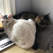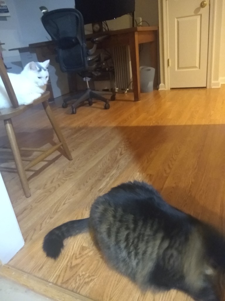 Before we get to the main subject of this post, we wanted to say that we are happy here. The lady human doesn’t play with us as much as we’d like, but she’s really nice and lets Waffle sit on her lap whenever Waffle wants to.