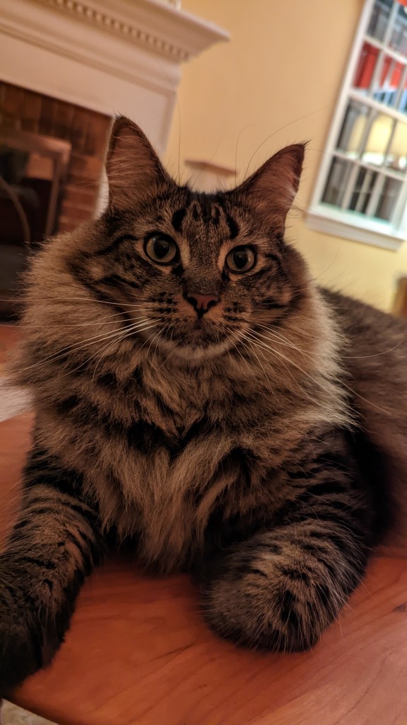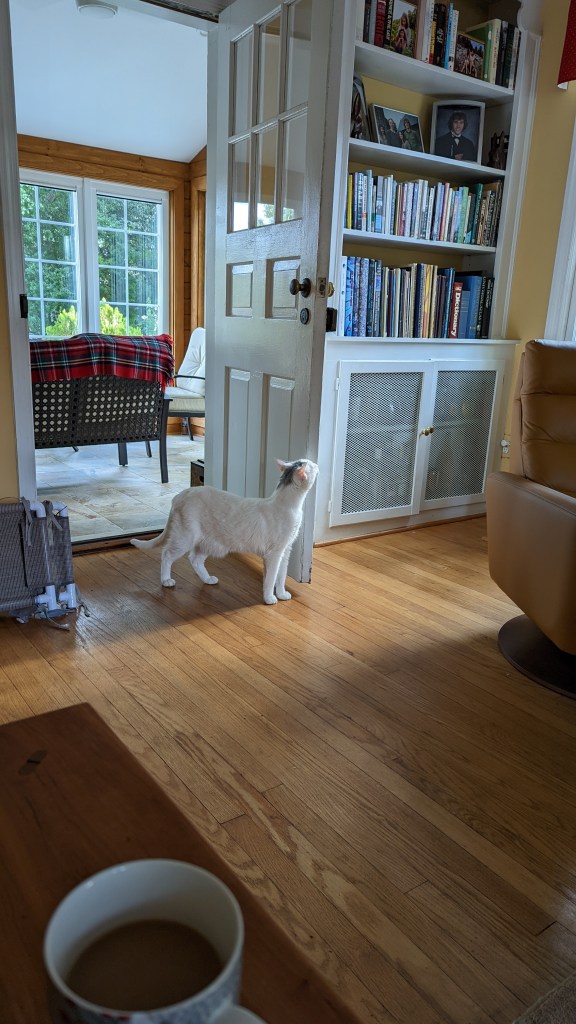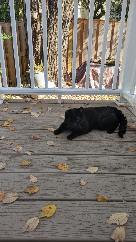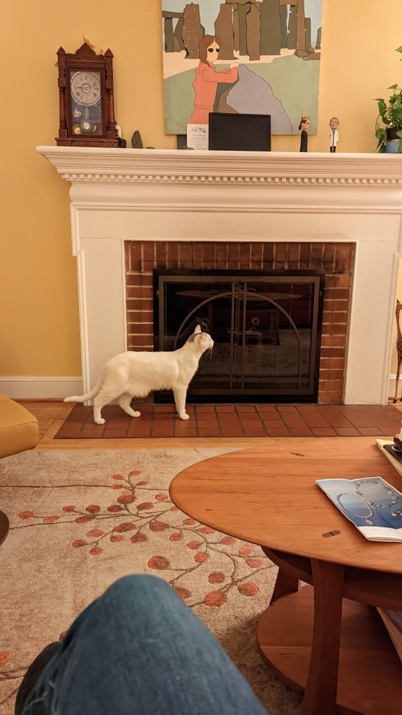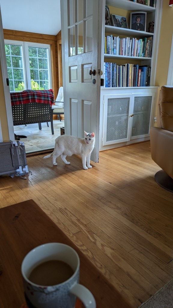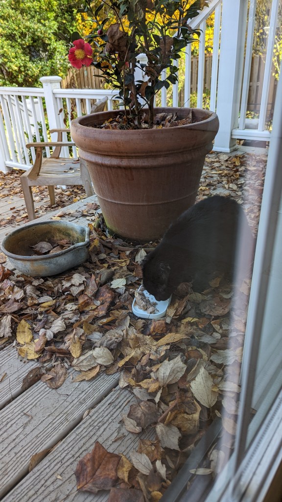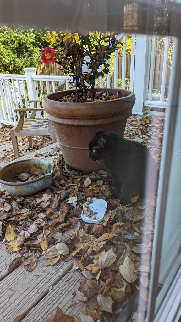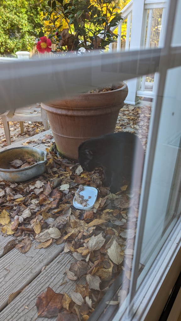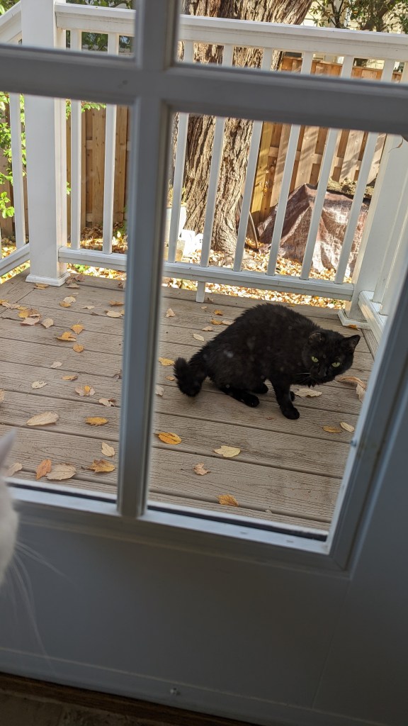 After shouting for Dean to come help me find the cats I looked out the lodge door and saw Waffle sitting on the porch. I let her in and went outside to search for Pony. I decided to go counter-clockwise around the house, not knowing how far he could have gotten — imagining the worst. Imagining that he’d been outside all night and eaten by the neighborhood foxes or coyotes or hit by a car. I called him and called him. Dean showed up with their food and shook the bag (the treats would have been more effective but at least he tried). I walked down one street and back and then continued looking and shouting (followed by Dean shaking the bag of food) in the front yard, looking up the streets that pass by our corner house.