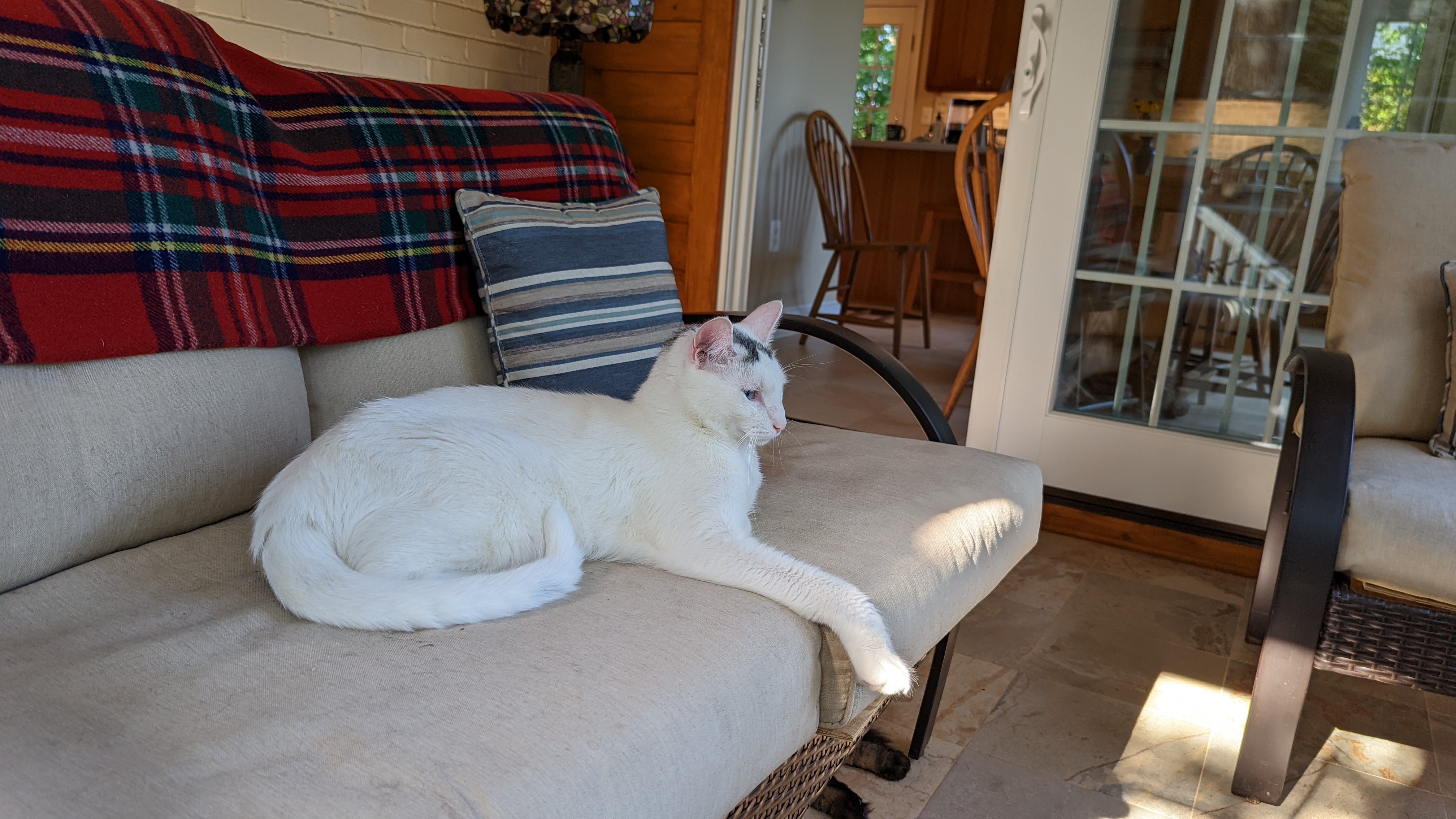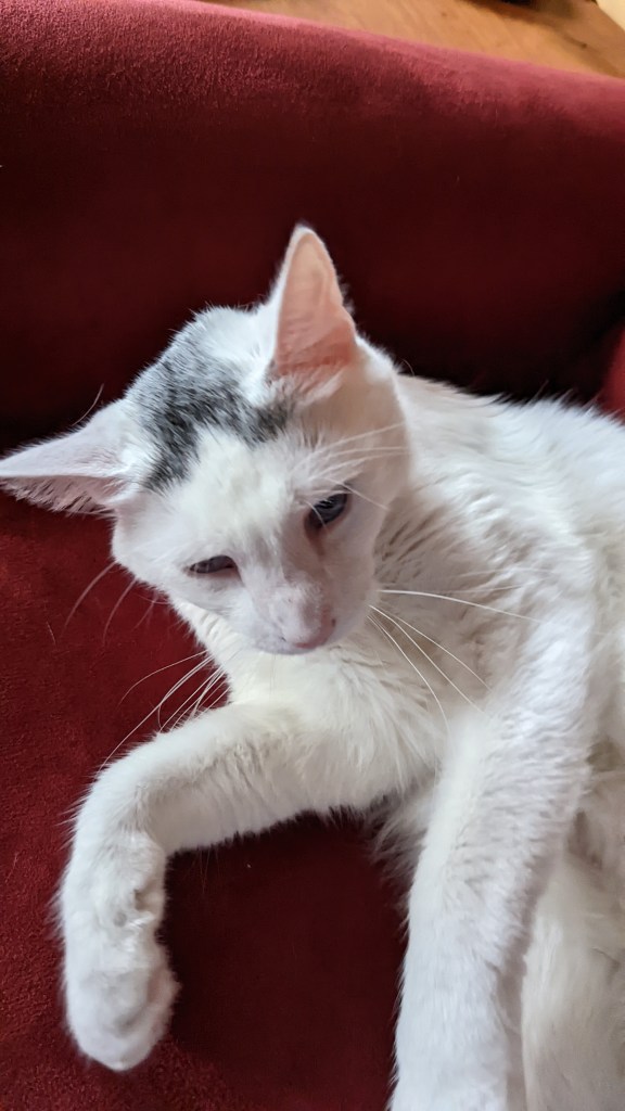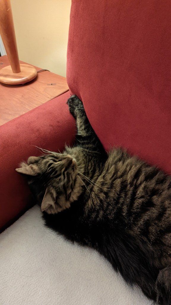 I’m finding new places to rest. While I still prefer to hang out under the bed, the humans have a comfortable chair in their bedroom and a nice firm love seat in the room with all the windows.
