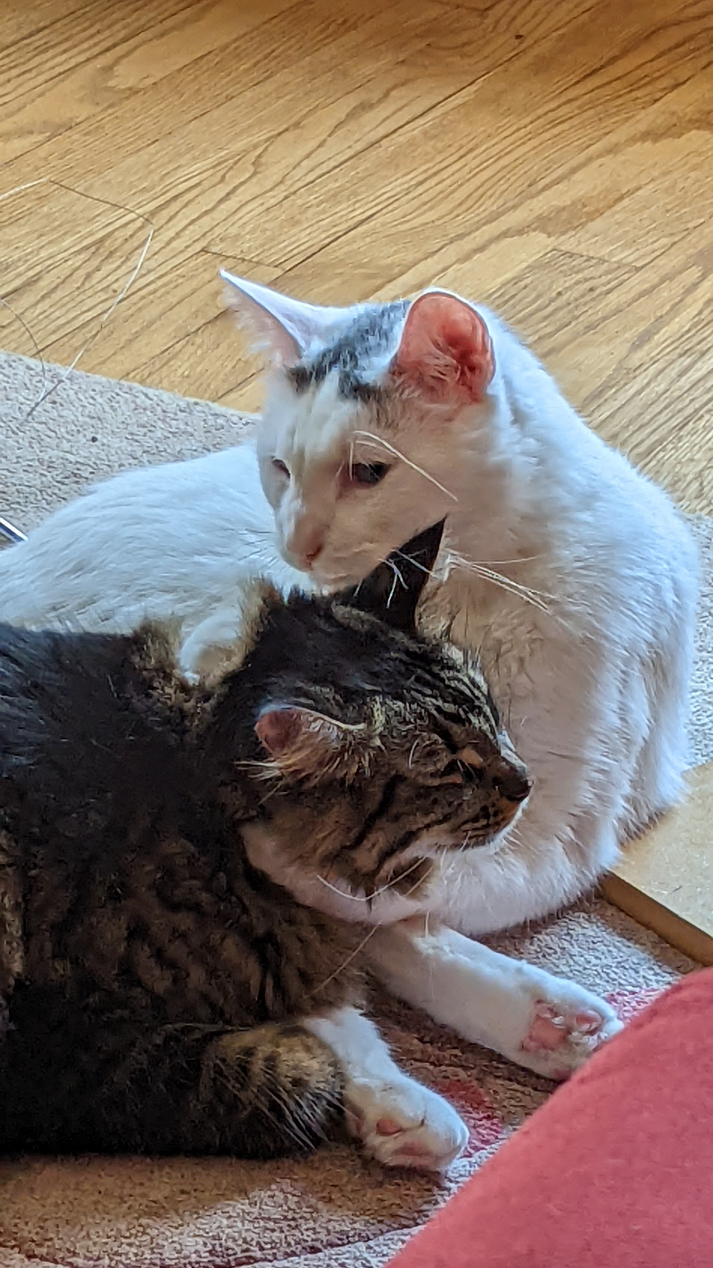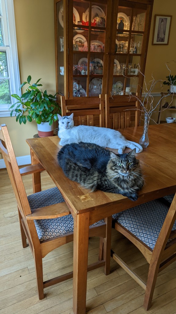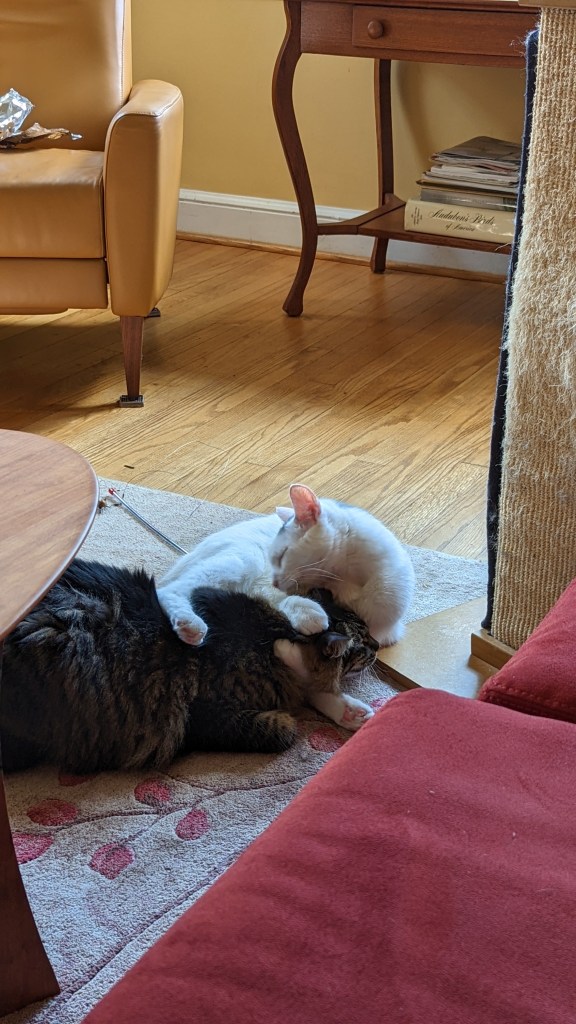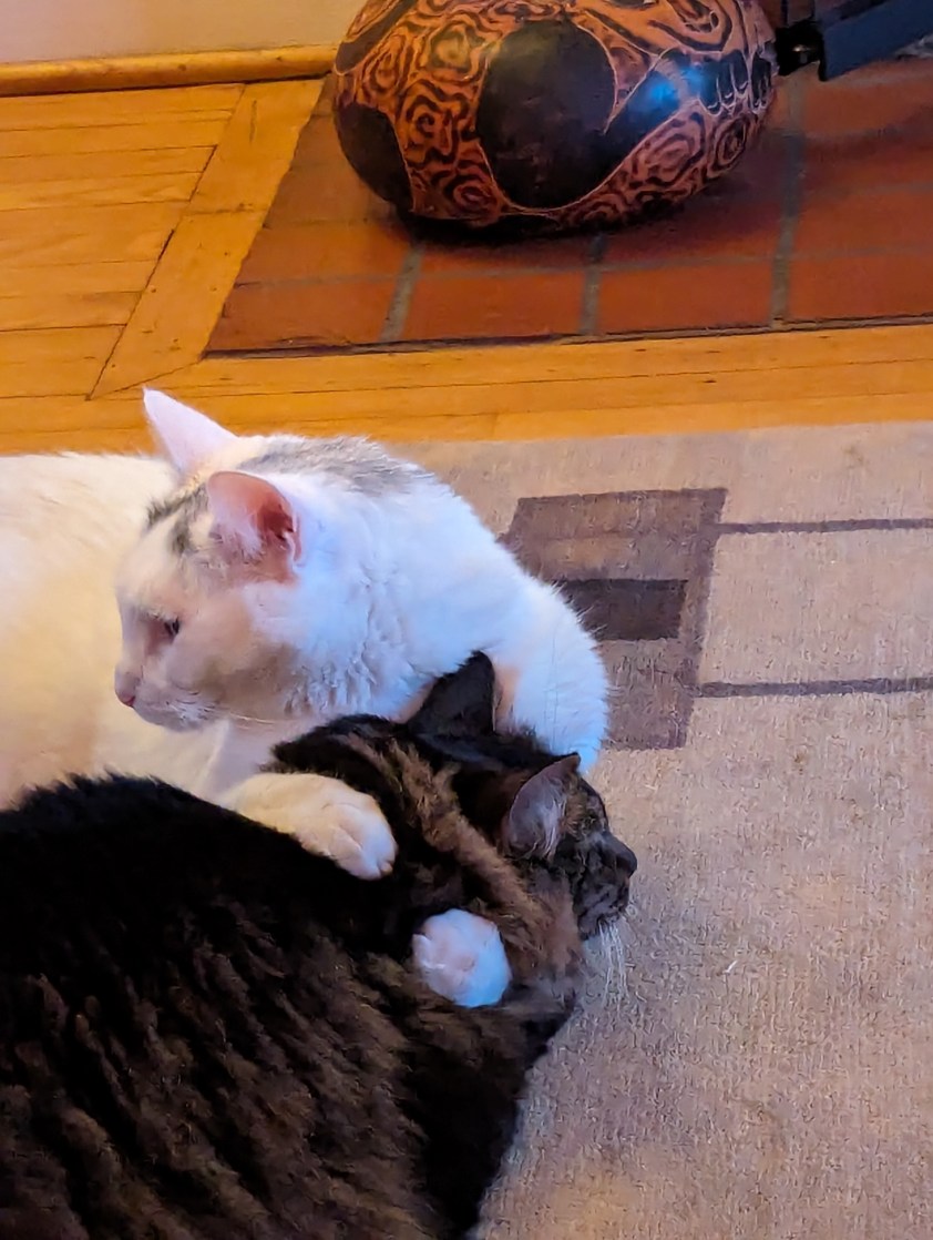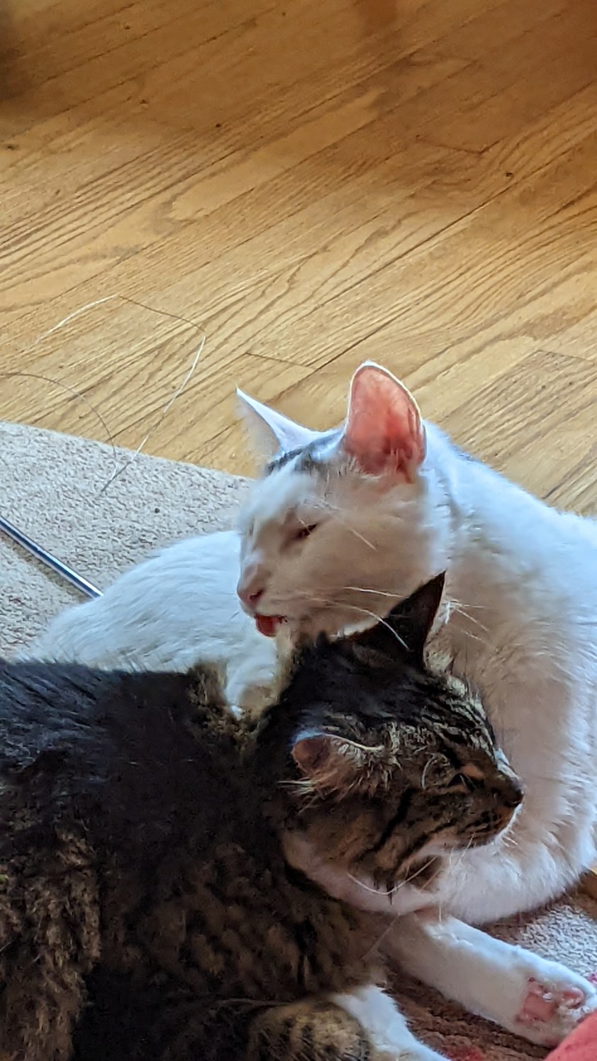 We don’t normally allow cats on tables, but one thing at a time!Grooming each otherCat napCat nap tooNot sure Waffle liked this groomingHe’s got her in a crossface plus legride (my son was a wrestler so I know these things)