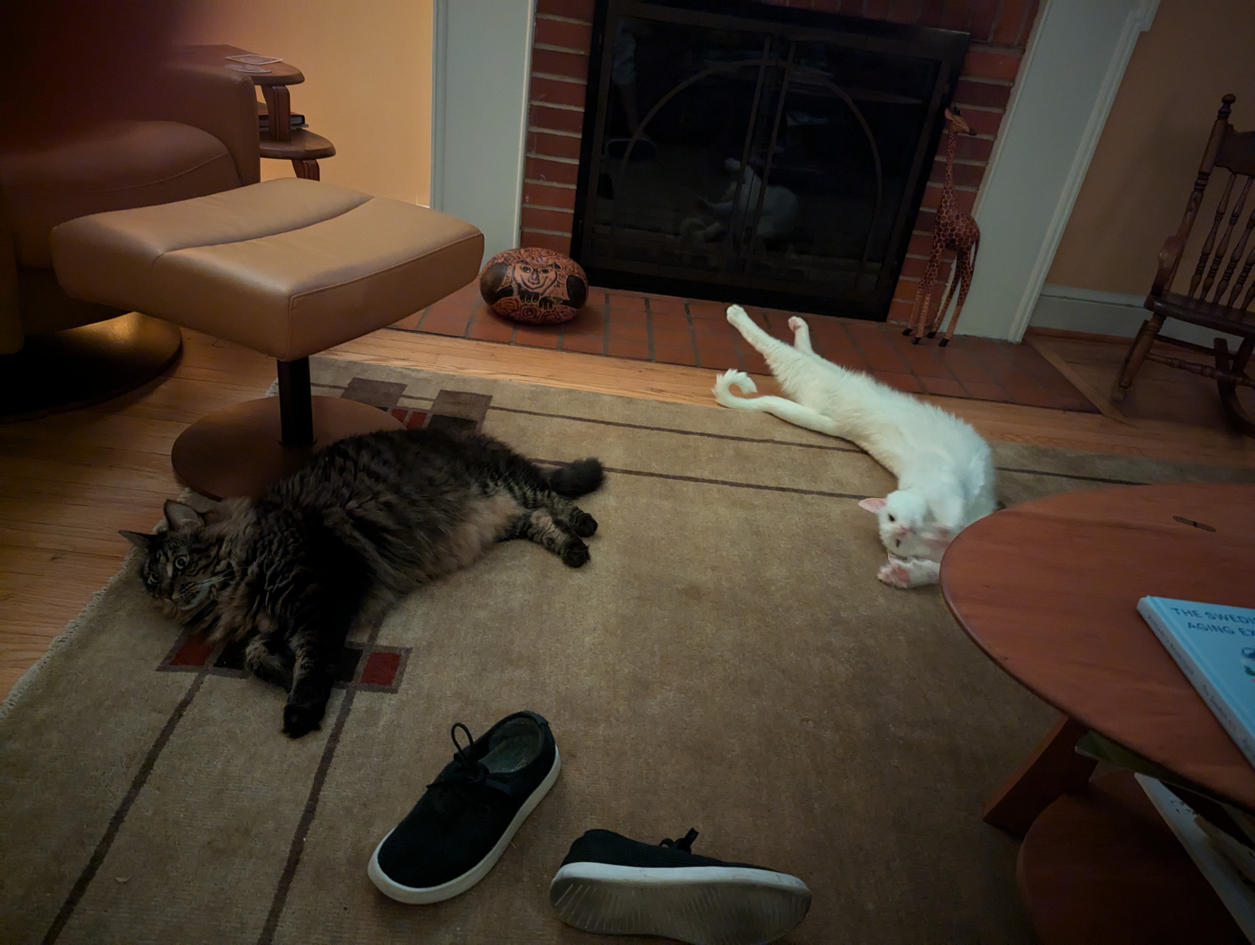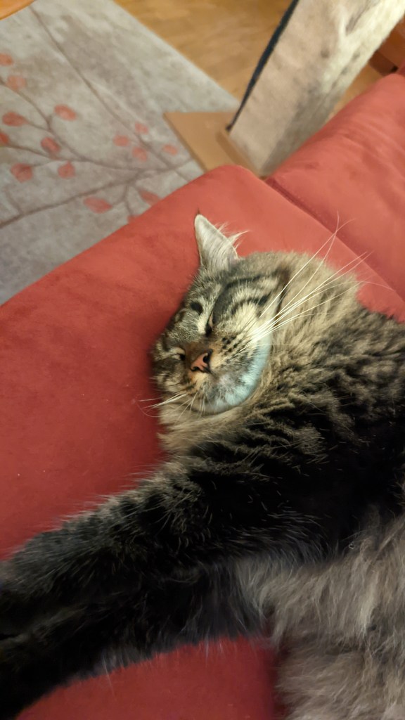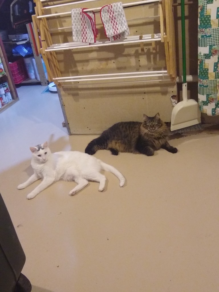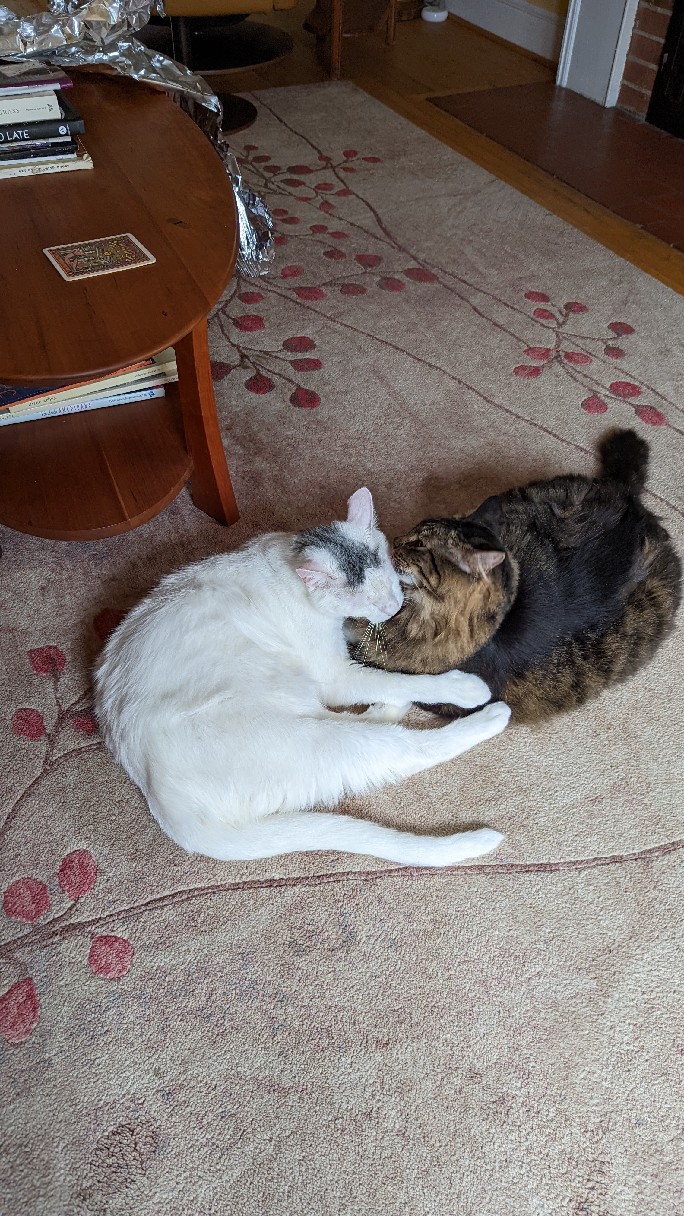 We don’t normally allow cats on tables, but one thing at a time!Grooming each otherCat napCat nap tooNot sure Waffle liked this groomingHe’s got her in a crossface plus legride (my son was a wrestler so I know these things)