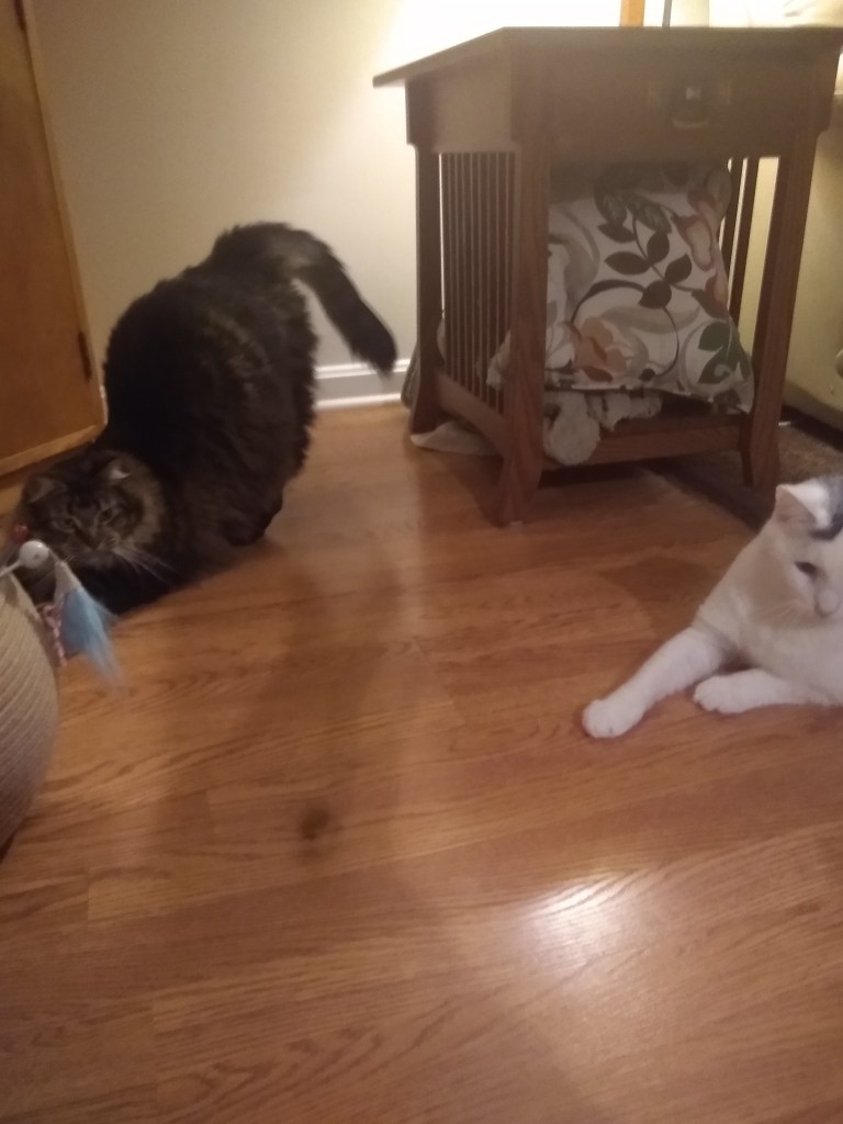 The lady human who lives here keeps pointing her phone at us. She pets us and plays with us too. This morning she tried to get me to play with the thing on a wire, but I could only pretend to be interested for her sake. At least Waffle played more enthusiastically and without pretense.