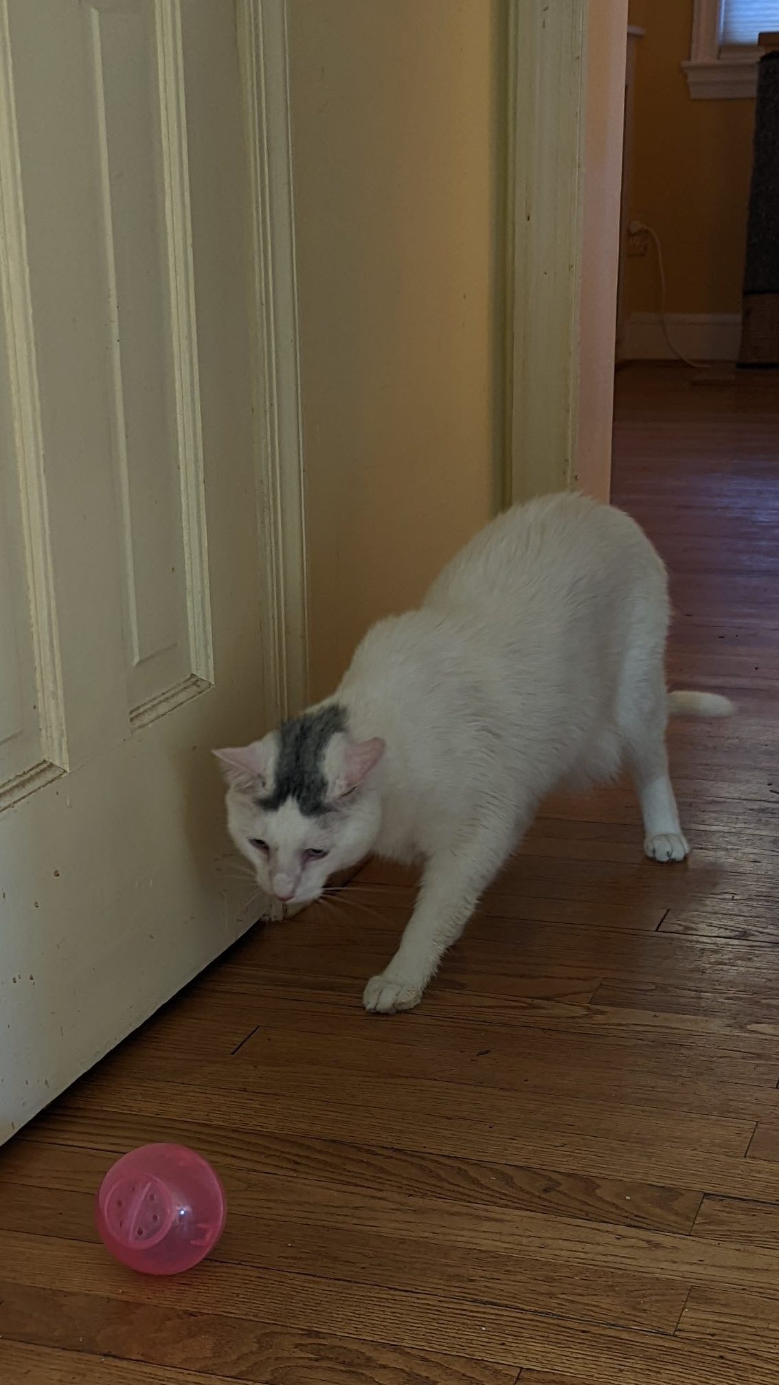 Pony is also 2-and-a-bit years-old. He’s pure white with a gray patch that goes from his forehead, between his ears, and ends on the back of his neck.